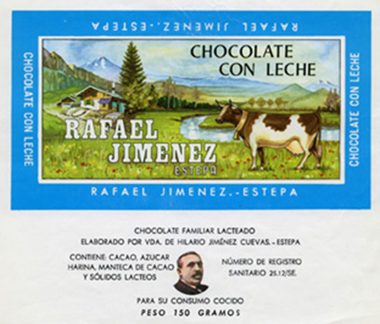 Rafael Jiménez Pérez, inmortalizado como “el tío del bigote” por el mostacho con el que aparecía en el centro de cada onza, nace en Estepa en 1867 y, tengo que confesarlo, me ha faltado tiempo para averiguar si sus antepasados ejercían el oficio. En los censos de 1900 aparece viviendo en la calle Saladillo nº 22 y por ese tiempo debió adquirir el ya mencionado palacio del marqués del Oro que unos diez años antes había dejado de ser una vivienda noble para contener el más antiguo oficio del mundo. Lo cierto es que a finales de mil ochocientos nos lo encontramos fabricando con la marca chocolates Rafael Jiménez en calle Castillejos 60 y 62.